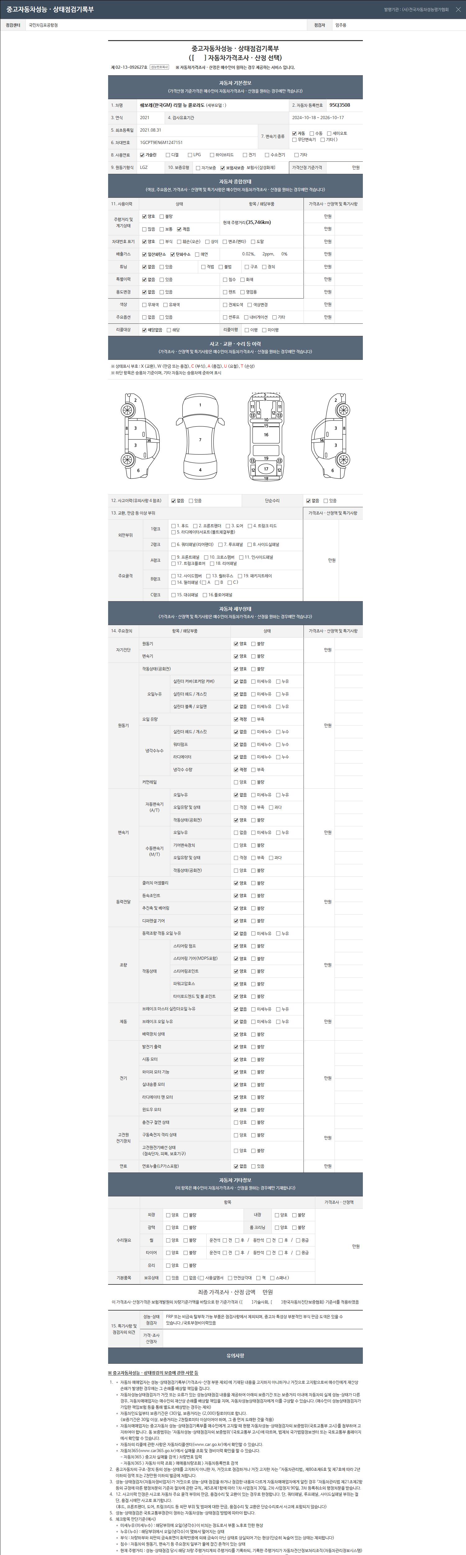 | 주행거리 | 35,746 km | 차량번호 | 95다3508 | 사고유무 | 성능기록부 참조 | 제시번호 | 제 2026038732 호 |