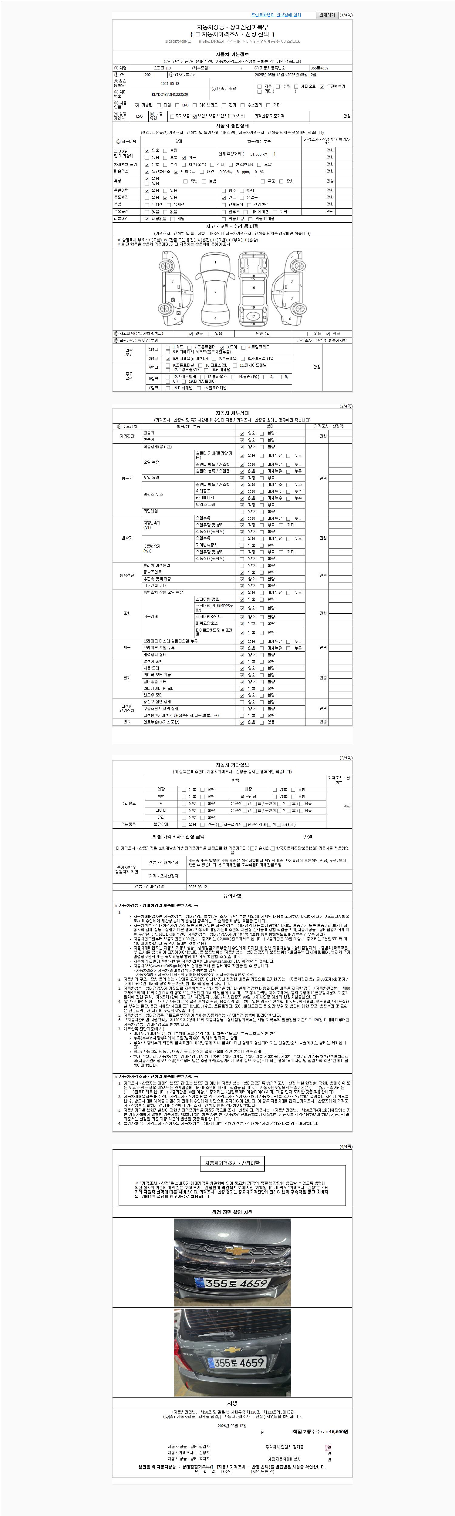 | 주행거리 | 51,508 km | 차량번호 | 355로4659 | 사고유무 | 성능기록부 참조 | 제시번호 | 제 2026013096 호 |
