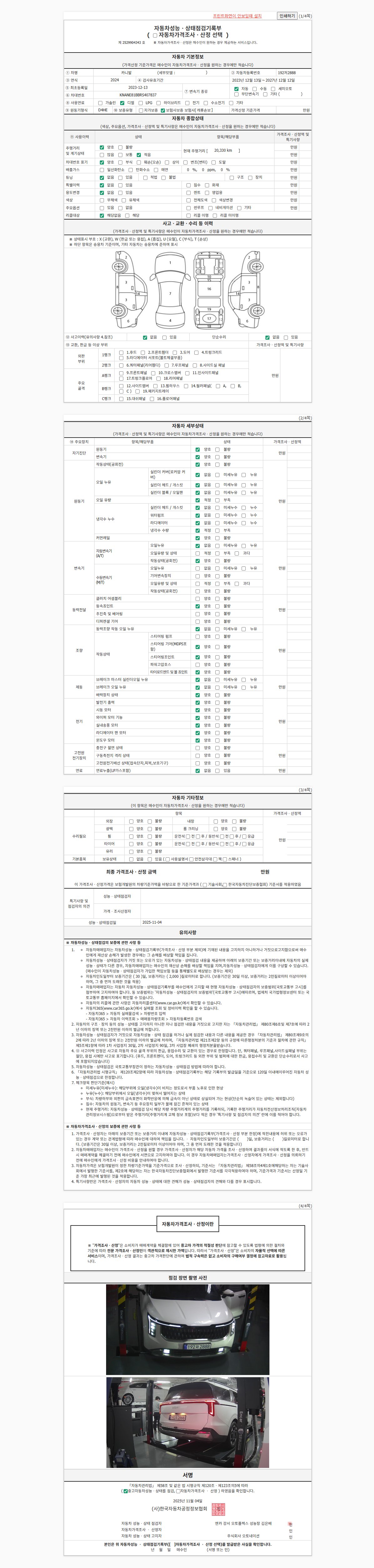 | 주행거리 | 20,329 km | 차량번호 | 192저2888 | 사고유무 | 성능기록부 참조 | 제시번호 | 제 2025149303 호 |