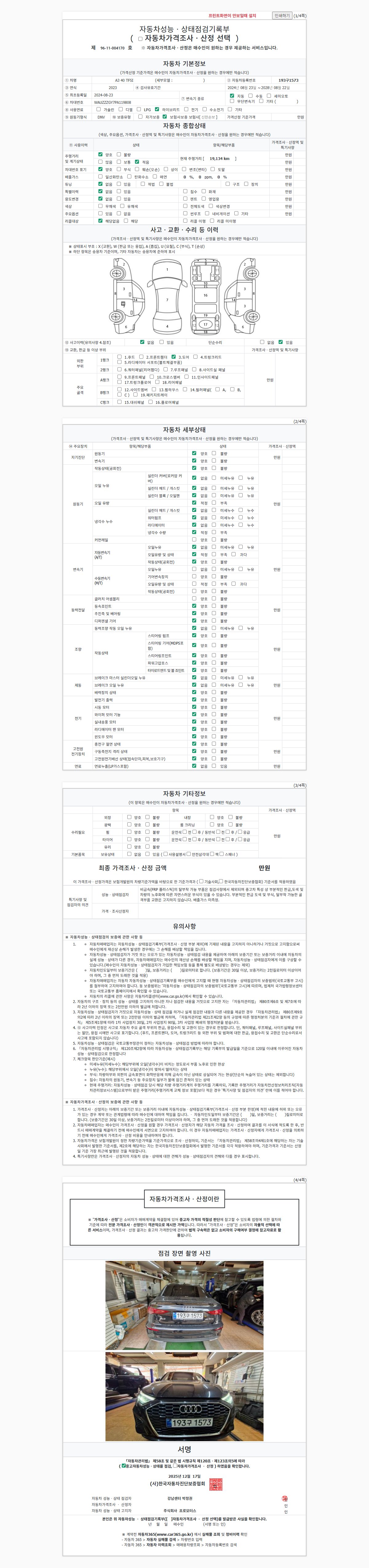 | 주행거리 | 19,134 km | 차량번호 | 193구1573 | 사고유무 | 성능기록부 참조 | 제시번호 | 제 2025171808 호 |