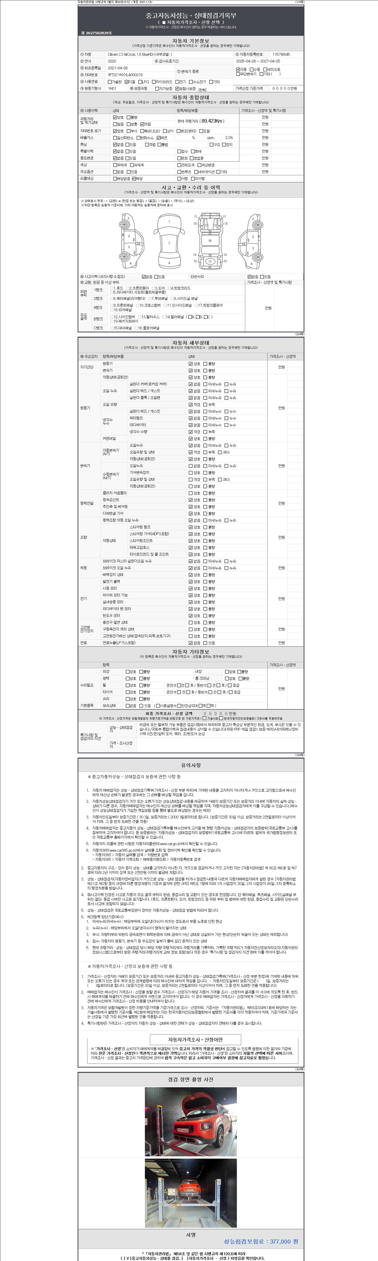 -중고자동차 매매업자를 통해 차량을 구입하실 경우 반드시 "중고자동차 성능, 상태점검 기록부"를 교뷰 받으셔야 하며, 매매업자는 반드시 의무 교부 하여야 압니다.
