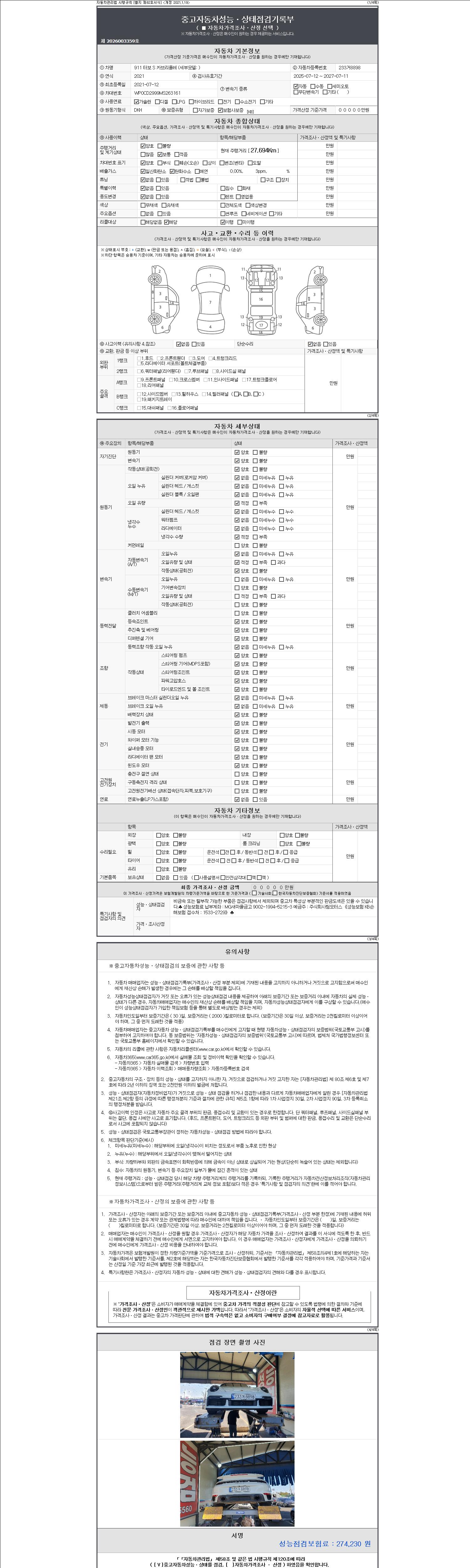 | 주행거리 | 27,694 km | 차량번호 | 233거8898 | 사고유무 | 성능기록부 참조 | 제시번호 | 제 2147483647 호 |