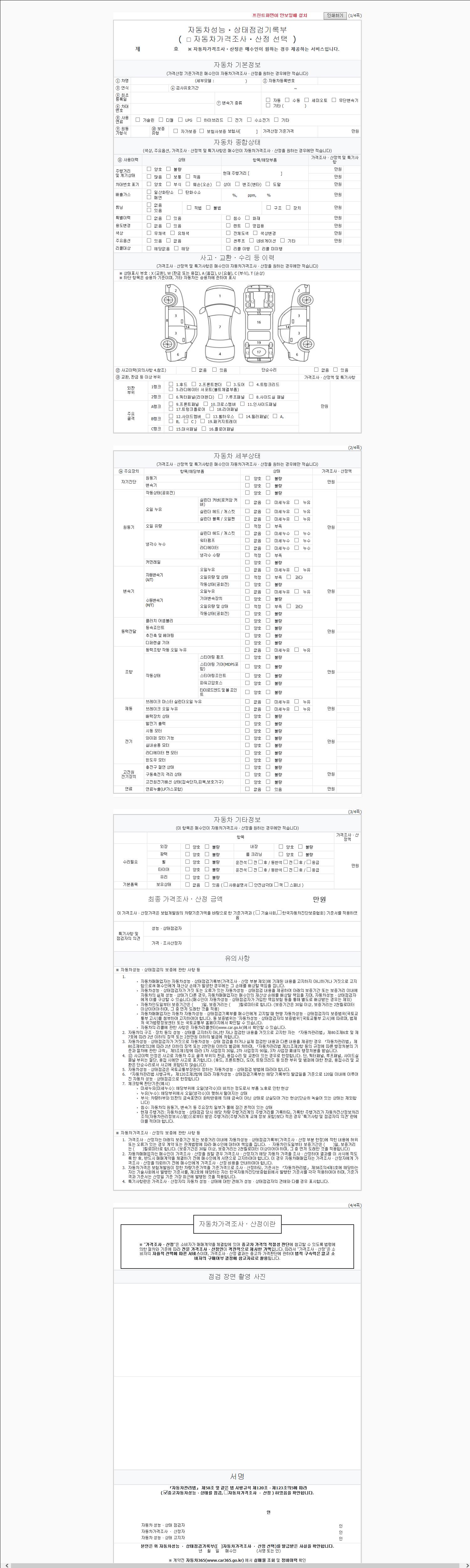 -중고자동차 매매업자를 통해 차량을 구입하실 경우 반드시 "중고자동차 성능, 상태점검 기록부"를 교뷰 받으셔야 하며, 매매업자는 반드시 의무 교부 하여야 압니다.