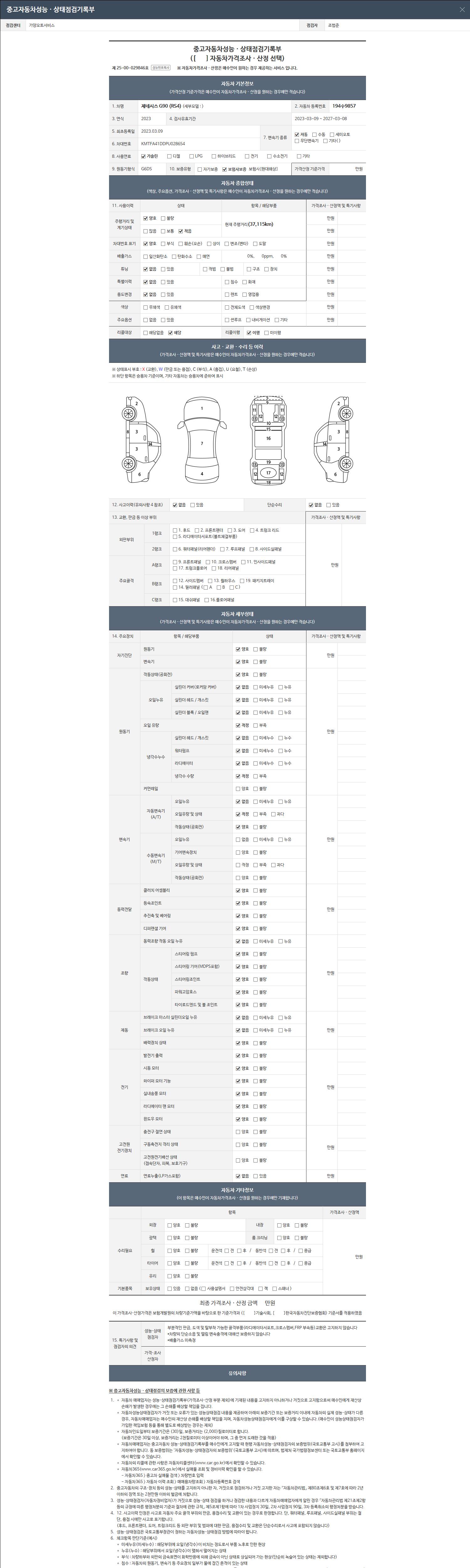 | 주행거리 | 37,115 km | 차량번호 | 194수9857 | 사고유무 | 성능기록부 참조 | 제시번호 | 제 2026037761 호 |